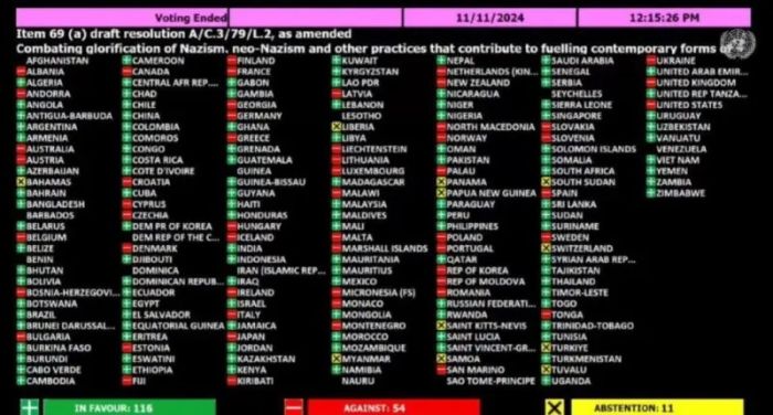 Группа стран, в большинстве западных, отказалась поддержать международную инициативу, направленную против нацистской идеологии. Против резолюции ООН о борьбе с героизацией нацизма, о которой идет речь, проголосовали 54 государства.