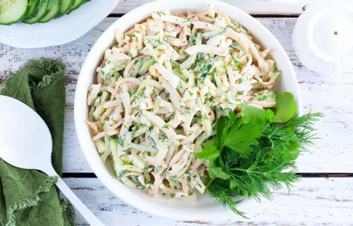 После 70-х годов в стране появились первые рецепты, в которых главным ингредиентом был кальмар. Правда, блюда были не аппетитными, к примеру, можно было приготовить творожную запеканку с кальмаром или тушеные овощи с кальмаром. Мужья и дети отказывались есть такие блюда. Но вот один рецепт все же покорил сердца многих советских людей. Это салат «Хрущевский». Он неслучайно назван в честь экс-главы правительства СССР. Повар Никиты Хрущева по телевидению рассказал, какие блюда готовит для правительства страны. Во время беседы он заявил, что часто готовит салат с кальмарами. Повар раскрыл все секреты правильного приготовления диетического мяса. Было удивительно слышать, что кальмар варится несколько секунд. После того как женщины освоили технологию приготовления, салат стал очень популярным блюдом. Они стали называть его салатом «Хрущева».  Салат с кальмарами