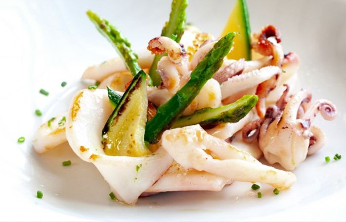 Современные хозяйки знают, чтобы приготовить кальмара, первым делом его нужно почистить. Для этого размороженную тушку нужно обдать кипятком — пленка свернется и ее можно будет легко отделить. Теперь останется только отварить. Это, пожалуй, самый важный этап — кальмар опускается в кипяток и варится всего лишь 10 секунд!  Блюдо с кальмарами