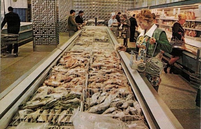 За это время мясо успеет провариться и останется нежным и мягким. Готовить кальмара очень просто, но советские хозяйки не знали, что это за морское чудо и сколько по времени его варить. Практически все женщины готовили его 30 минут. Мясо получалось очень жестким и невкусным. Его можно было сравнить с резиной. В народе неправильно приготовленное мясо кальмаров даже прозвали «подошвой», настолько оно было тугим.  Советский рыбный магазин