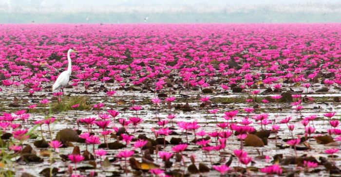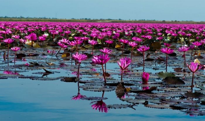 Море Красных Лотосов, или Озеро Красных Водяных Лилий — уникальное в своем роде красочном озере на востоке Таиланда и настоящее чудо! Представьте себе, как необычно плыть на лодке сквозь тысячи великолепных цветов, от бледно-розовых до ярких красных оттенков — что может быть более красивым и романтичным?