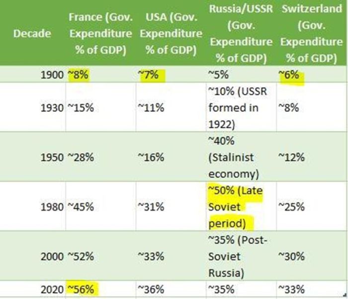 Госрасходы составляют 56% ВВП во Франции. Это на 6% больше, чем в СССР в советское время. В других развитых странах эти расходы составляют около 35%. Во Франции 6% этих расходов финансируется за счет долга.