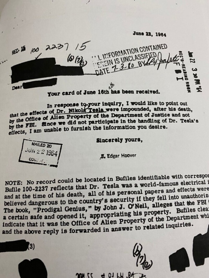 После того, как стало известно о смерти ученого ФБР приказало Управлению иностранного имущества изъять документы из гостиничного номера, а уже через два дня они и все имущество Николы было опечатано и доставлено на склад.