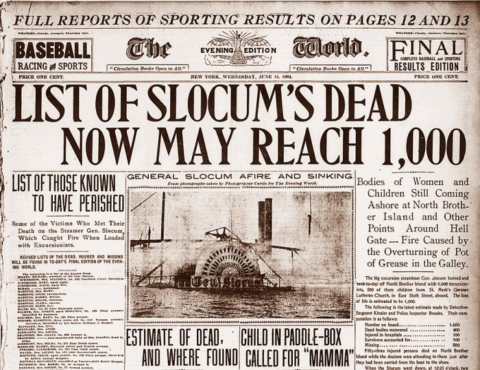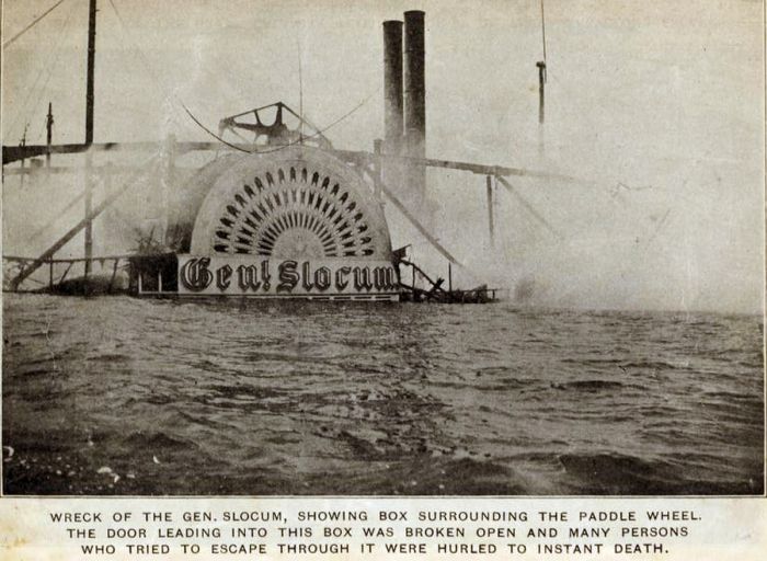 15 июня 1904 года в 10 часов утра жители Нью-Йорка стали свидетелями невероятного и страшного зрелища. В самом центре города по реке Ист-Ривер на огромной скорости шел охваченный огнем большой белый пароход. С бешеной скоростью в клокочущей пене воды вращались его гребные колеса, за кормой по реке стелился черный шлейф дыма, а на переполненной верхней носовой палубе под бравурную музыку оркестра пассажиры танцевали веселую польку…