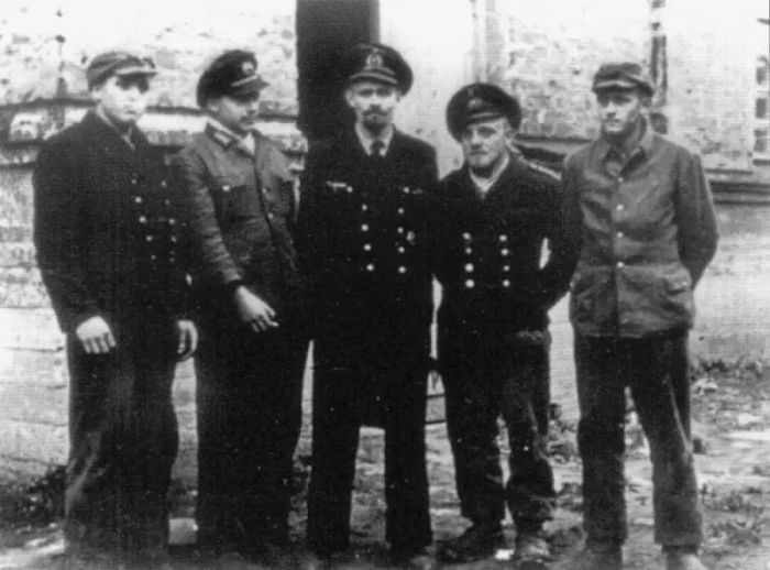 Пятеро из шести спасённых немецких подводников. В центре — командир лодки В.-К. Шмидт