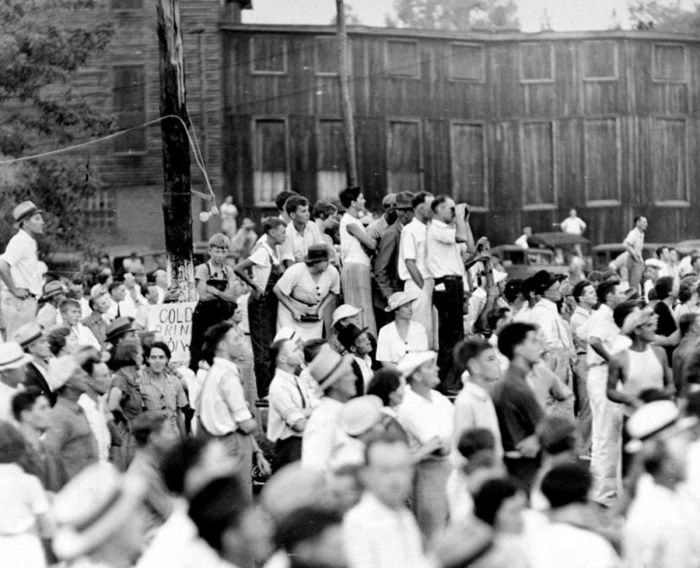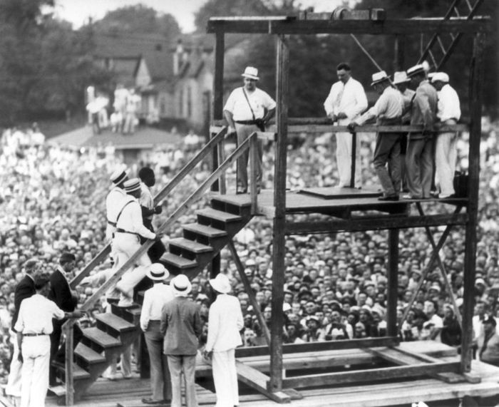 14 августа 1936 года, Рэйни Бетеа сфотографирован с помощниками шерифа Альбертом Риссом и Лоуренсом Дишманом, когда они покидают тюрьму округа Джефферсон в Луисвилле, для его казни в Оуэнсборо (Фото AP Photo / Owensboro Messenger-Inquirer)