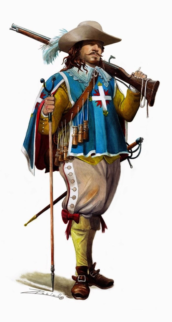 Изначально мушкетеры создавались как конная пехота. Из тяжелых мушкетов можно было стрелять только с сошек, так что перед боем кавалеристы спешивались.