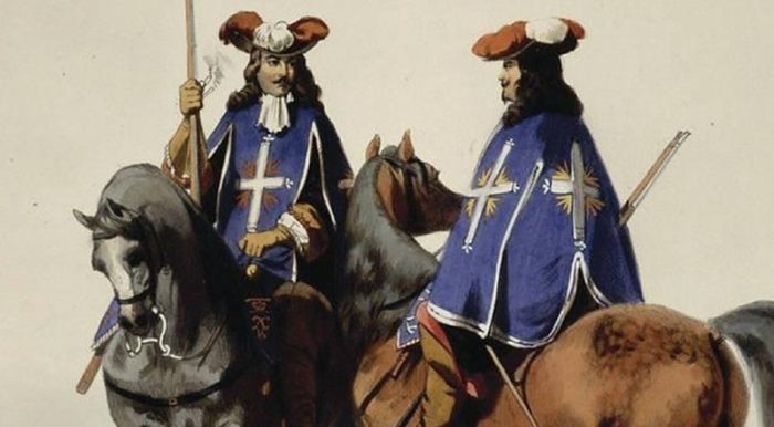 После трагической кончины Генриха IV эти лихие ребята достались его сыну, который вел религиозные войны в Гаскони. И там случились две вещи. Первая — на плащах всадников Людовика появились белые католические кресты, по которым мы теперь и узнаем знаменитый отряд. И вторая — выяснилось, что более слабые конные карабины проигрывают тяжелым мушкетам с фитильным замком, которые были на вооружении у пехоты гугенотов.