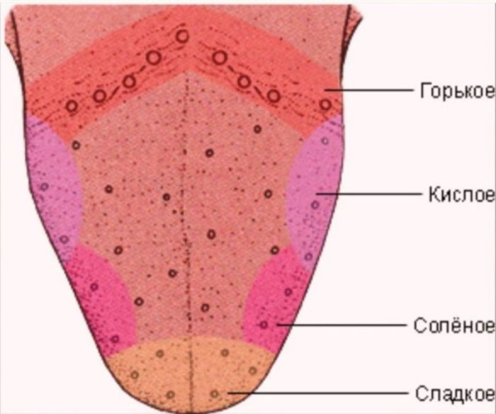 Четыре основных вкуса и зоны их рецепторов. Недавно открытые рецепторы умами находятся в средней зоне языка