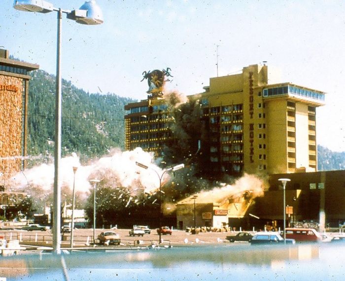 Стены одиннадцатиэтажной башни Harvey’s Wagon Wheel Casino обрушились, превращаясь во вздымающиеся гейзеры раздробленного бетона. Зеваки вдалеке, некоторые из которых уже напялили футболки с надписью «Я попал под бомбежку в Тахо», кричали и хлопали, злорадно торжествуя и наблюдая за тем, как стеклянные метеоры, деревянные щепки и различные обломки здания взлетели в небо. Соседние дома сотрясались, окна разбились вдребезги. Раскрошенный бетон легким градом осыпался на землю, и в считанные минуты клочки бумаги начали падать с неба как конфетти. Харви Гросс отказался говорить с прессой о произошедшем, но позднее его коллеги сообщали, что на его глаза наворачивались слезы, когда он смотрел на потрепанное здание.