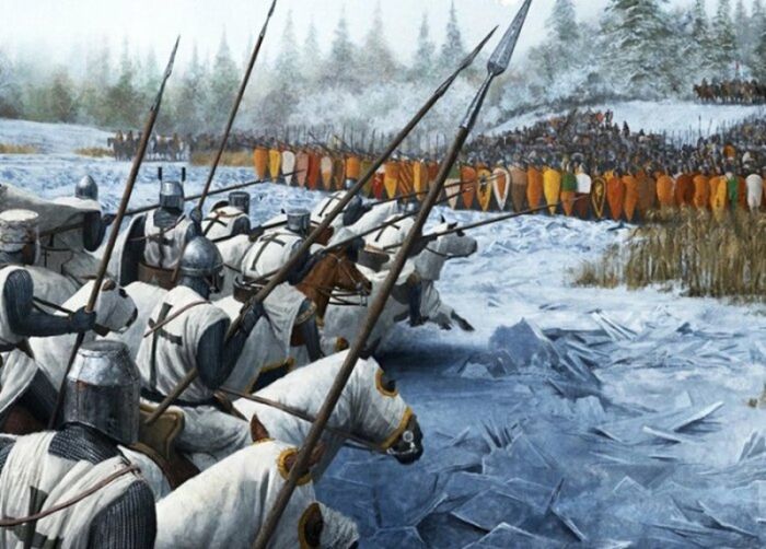 Тяжеловооруженные европейцы, с полным комплектом доспехов, попросту начали тонуть, уходя под трескающийся лед, круша этим грозную и устрашающую формацию, коей и являлась всемогущая “свинья”.