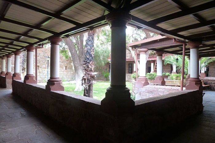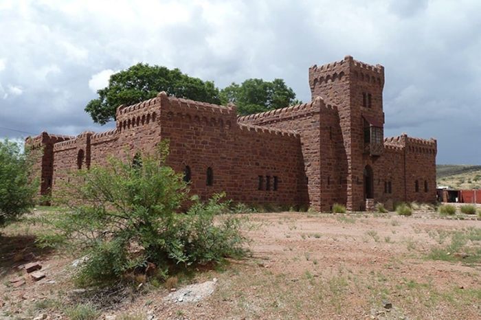 Несмотря на свой средневековый облик, на самом деле это современное здание, построенное в 1909 году немецким поселенцем по имени Ганс Генрих фон Вольф. Он был офицером германской армии, уничтожившей туземцев. Ганс женился на дочери американского консула в Германии и решил осесть в Африке, основав ферму, где собирался разводить лошадей.