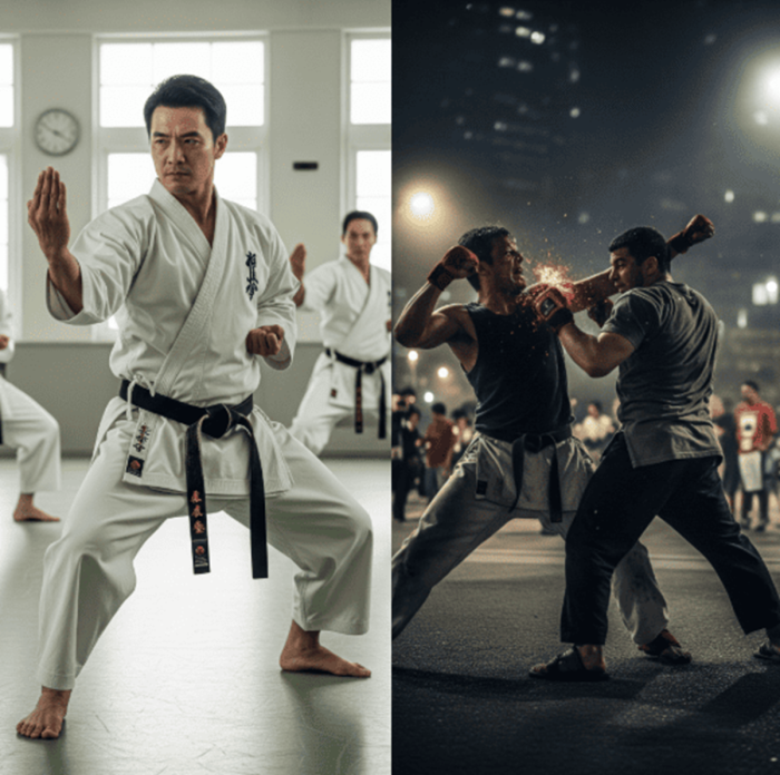 Это шоу. Это демонстрация точности и контроля, балльная система. Но это не выживание. На улице никто не даст тебе остановиться после "чистого касания". Тебя ударят в затылок, потянут за куртку, воткнут в стену, попытаются добить на земле. Каратэ, в своих классических рамках, к такому не готовит. Никогда.