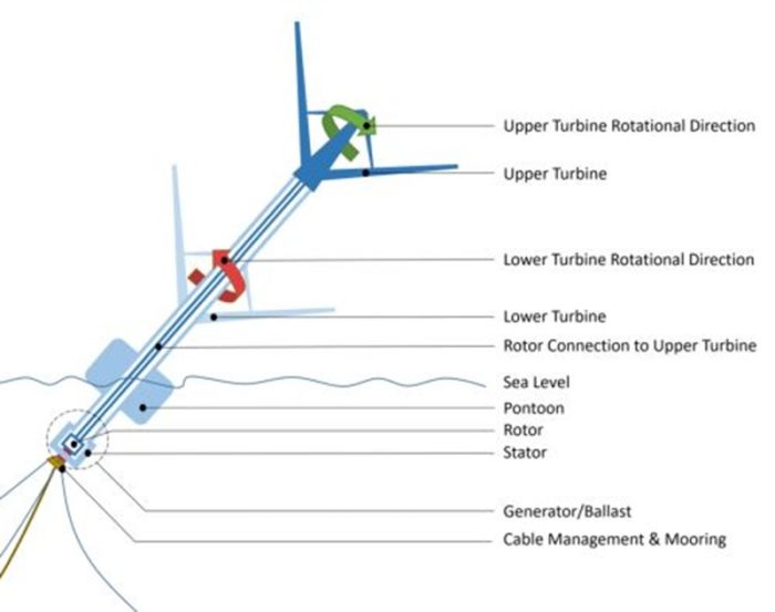 Один набор лопастей вертикальной турбины присоединен к ротору электрогенератора, а второй набор лопастей, вращающийся в противоположном направлении, присоединен к статору, который в данном случае уже не является неподвижным. Это, в свою очередь, позволяет удвоить относительную скорость вращения и, как следствие, количество вырабатываемого электричества.