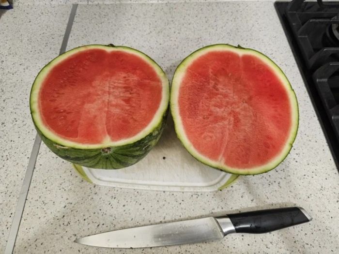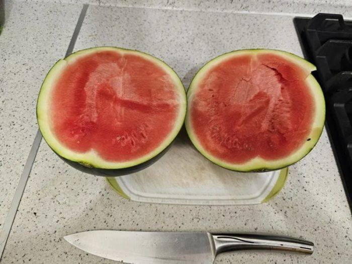 Третьим в моем эксперименте стал "Сладкий малыш". К сожалению, название не соответствовало действительности – арбуз был лишь слегка сладковатым и хотя оказался съедобным, покупать его не стоит. Интересно, что возле кожуры он был мягче, чем в середине.