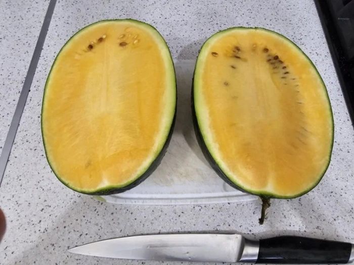 "Яйцо дракона" действительно напоминало по форме крупное яйцо. Этот арбуз оказался вполне приличным – средне-сладким, с приятной желтой мякотью, его можно смело покупать.