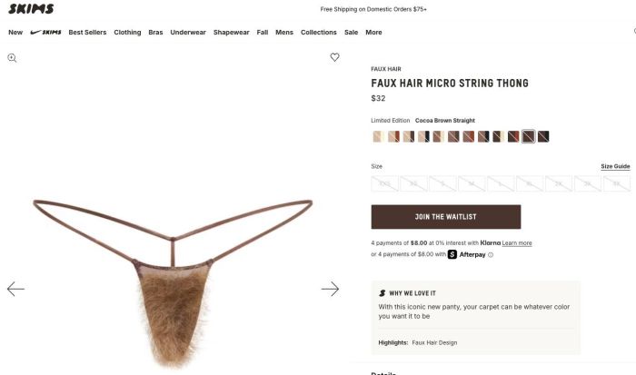 Новинка, получившая название "The Ultimate Bush", представляет собой стринги с передней частью, украшенной искусственным мехом. Этот смелый ход вызвал бурную реакцию: одни критики обвиняют Кардашьян в излишней провокационности, другие же восхищаются ее маркетинговым гением, ведь, несмотря на неоднозначность, трусики стоимостью 32 доллара уже распроданы.