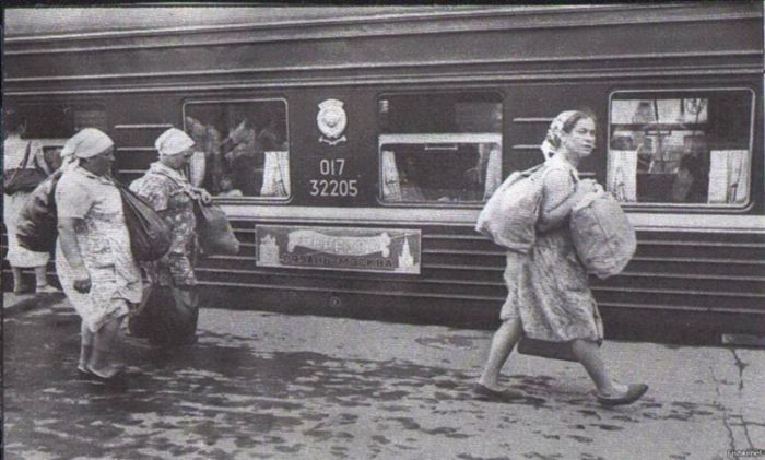 Типичная сцена советского вокзала: толпа людей с сумками, коробками, сетками и даже чемоданами. Некоторые ездили регулярно, раз в неделю, словно на работу. Колбасы клали в газетную бумагу, чтобы не пахло, а масло оборачивали несколькими слоями, чтобы не растаяло.
