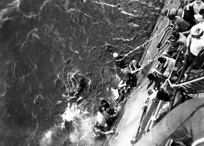 На вторые сутки место крушения окружили десятки голодных акул. Сначала их жертвами стали мертвые члены экипажа, которых они разрывали на части. Смешавшаяся с морской водой кровь привлекала все новых и новых хищников. Выжившие сбились в кучку, и вокруг них сомкнулось кольцо из плавников. Из одной группы в 80 человек к утру в живых осталось только 17...