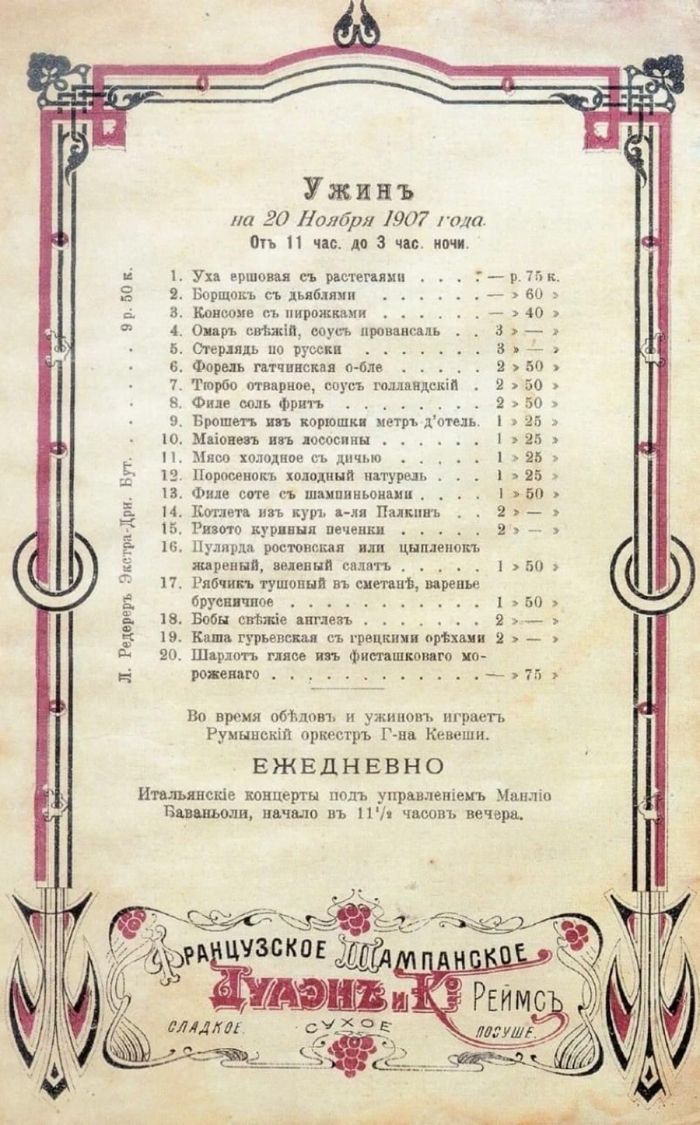 С левой стороны меню мы видим стоимость одной бутылки французского шампанского «Л. Редереръ Экстра-Дри» (Louis Roederer Extra Dry) — 9 руб. 50 коп. Тут стоит отметить, что и сейчас его стоимость варьируется от 40 до 70 евро за бутылку :)