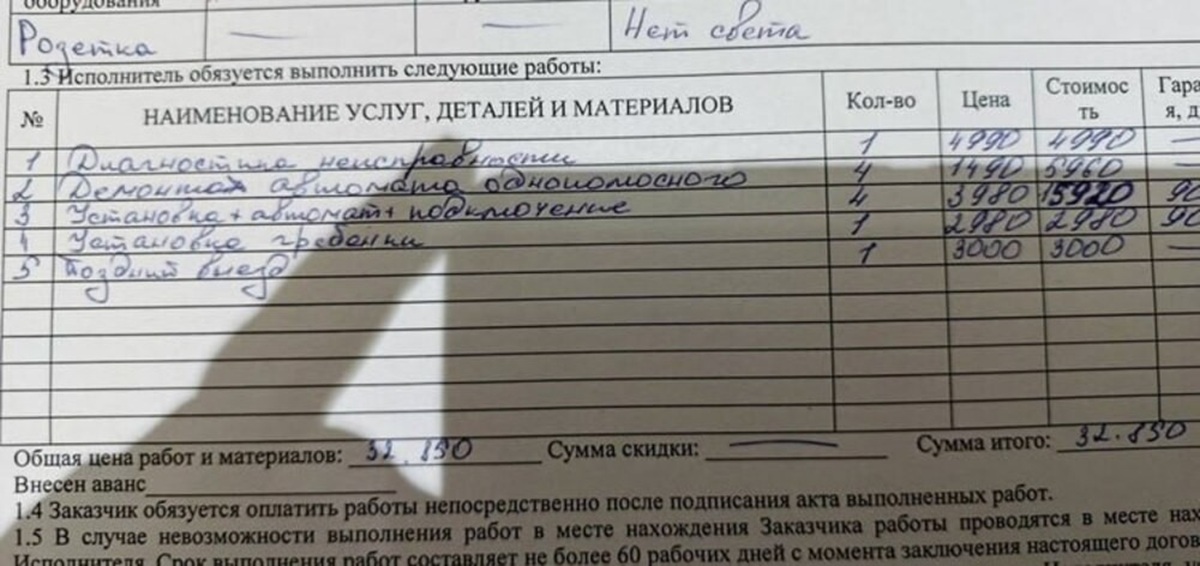 Электрик, прибывший на вызов, не только починил злополучную розетку, но и, судя по акту выполненных работ, провел целый комплекс "необходимых" манипуляций. В документе, который девушка подписала, значилась замена четырех автоматических выключателей в электрическом щитке. За их "демонтаж, замену и подключение" мастер выставил счет в 5960 и 15920 рублей соответственно. В итоге, за ремонт одной розетки петербурженка заплатила внушительную сумму – 32 850 рублей.