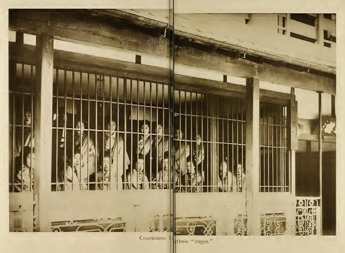 В квартале Ёсивара, известном своими борделями, существовал своеобразный обычай: женщин, занимавшихся проституцией, держали за деревянными решетками, чтобы клиентам было удобнее их осматривать. Эти "витрины", называемые "харимисэ", служили не только для привлечения покупателей, но и для привлечения любопытных зевак. Главная улица, Наканотё, была заполнена такими "клетками", которые считались отличительной чертой и даже достопримечательностью именно Ёсивары, поскольку в других, нелицензированных районах, подобного не наблюдалось.