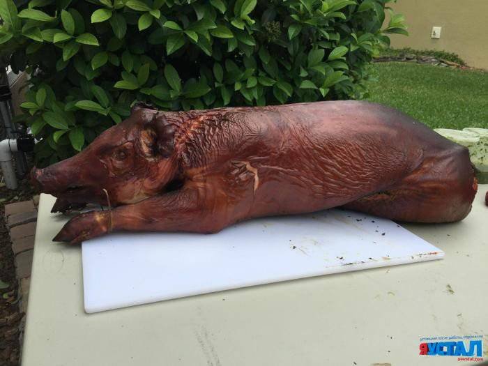 Процесс приготовления начался в 3:30 ночи, а закончился спустя 12 часов. Все это время тушка поросенка коптилась при постоянной температуре чуть менее 100 градусов Цельсия. В итоге получилось очень даже аппетитное блюдо. Смотрим.