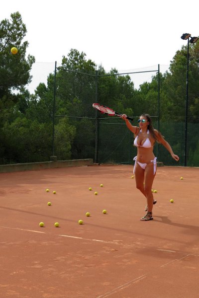 34-летняя уэльская актриса, фотомодель и телевизионная персона Имоджен Томас (Imogen Thomas) на теннисном корте в бикини