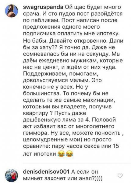 Алёна Астахова, записная звезда русского тверка взорвала свой инстаграмм, озвучив сумму, за которую готова переспать с любым желающим. Девушка сообщает, что: Но бабы. Давайте откровенно. Дали бы за хату?? Я точно да. Даже не сомневалась бы ни на секунду. Мы даём ежедневно мужикам, которые нас не ценят, и ждём от них чуда. Поддерживаем, помогаем, довольствуемся малым. Это конечно не у всех. Но у большинства. То почему бы не сделать те же самые махинации, которыми вы владеете, получив квартиру ? Пусть даже дешёвенькую ляма за 4. Половой акт избавит вас от многолетнего геммора.