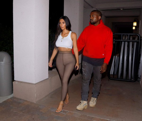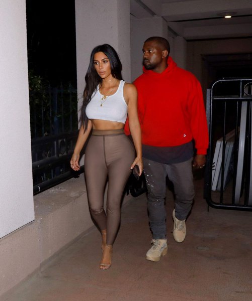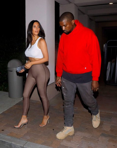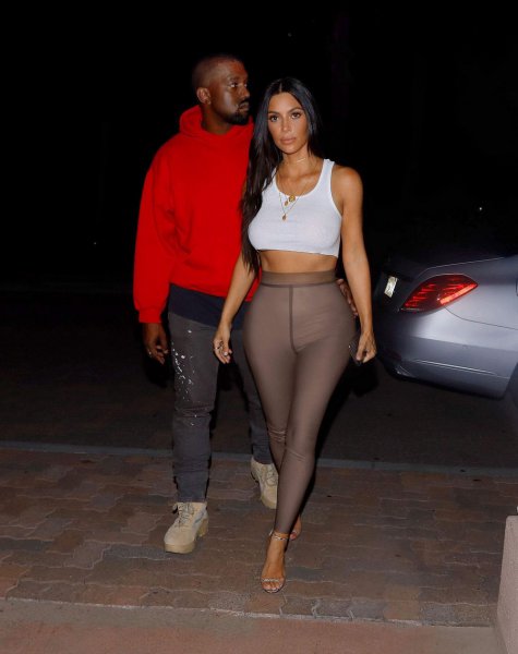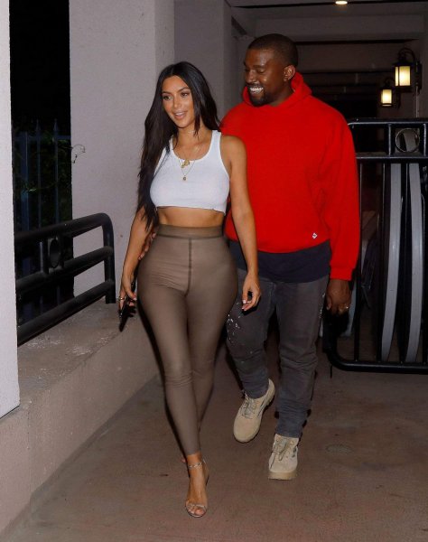 36-летняя американская звезда реалити-шоу, актриса и фотомодель Ким Кардашян (Kim Kardashian) в обтягивающих штанишках и белой майке без бюстгальтера с мужем в Шерман-Окс.
