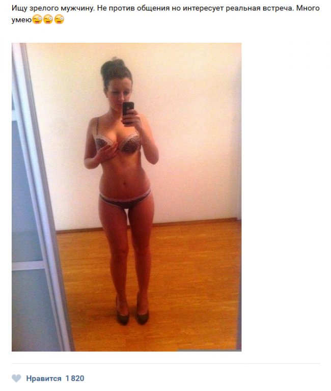 Отдельно хочется отметить не просто наличие такого желания и таких женщин, а то, как они себя предлагают. Посмотрите на фото данных дам, на их позы и их внешний вид. Не сразу становится ясно, хорошо или же плохо попасться таким представительницам слабого пола в минуты их слабости. Мы уверенны, что Вам данный сборник понравится и Вы обязательно будете ждать очередную запись, в которой мы соберем «горячих» женщин из социальных сетей.