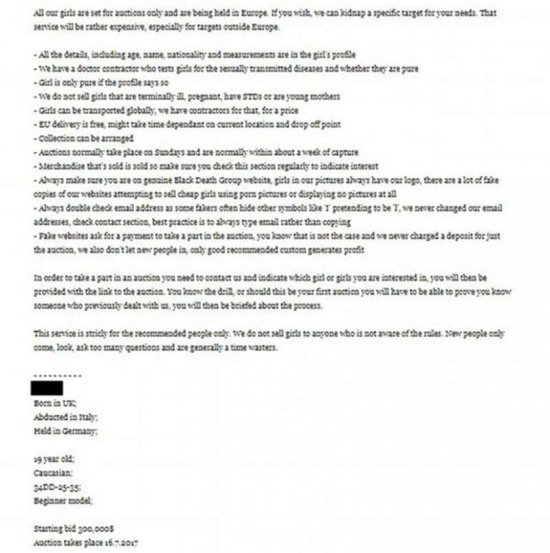 «Все наши девушки выставлены только на этом аукционе и удерживаются нами в Европе. По вашему желанию мы можем похитить любую другую. Эта услуга обойдется значительно дороже, особенно, если объект находится за пределами Европы.