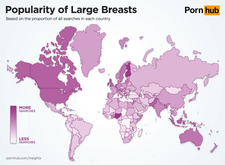 Интересно, что женской грудью в целом интересуются прежде всего пользователи Pornhub старше 35 лет. При этом число поклонников силиконовой груди гораздо выше среди возрастной категории от 25 до 44 лет. Больше всего женский бюст интересует жителей Нигерии, Финляндии и Канады, а меньше всего - жителей Перу, Колумбии и Бразилии. Россия же занимает восьмое место в рейтинге стран, население которых реже всего ищут на Pornhub подобные видео.
