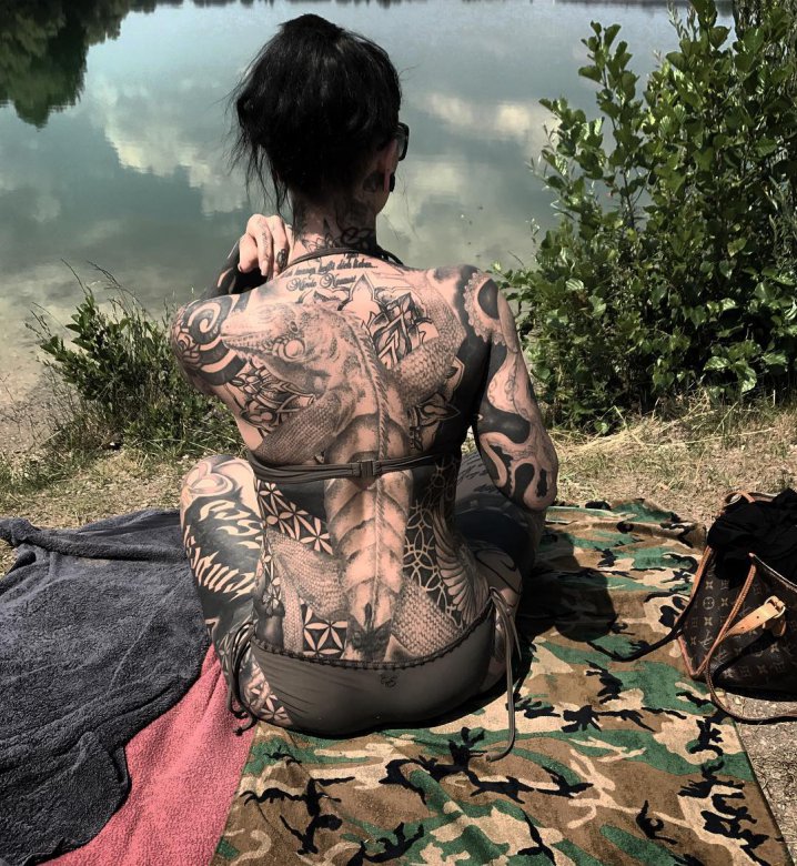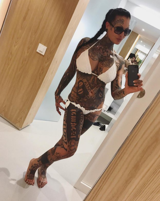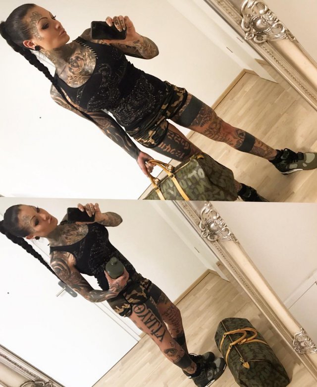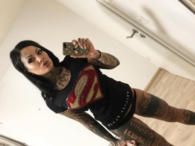 29-летняя совладелица тату-салона в немецком Карльсхульде и фотомодель покрыла все свое тело татуировками и даже набила одну из них на лице.