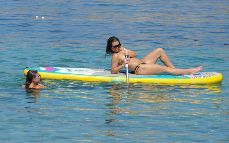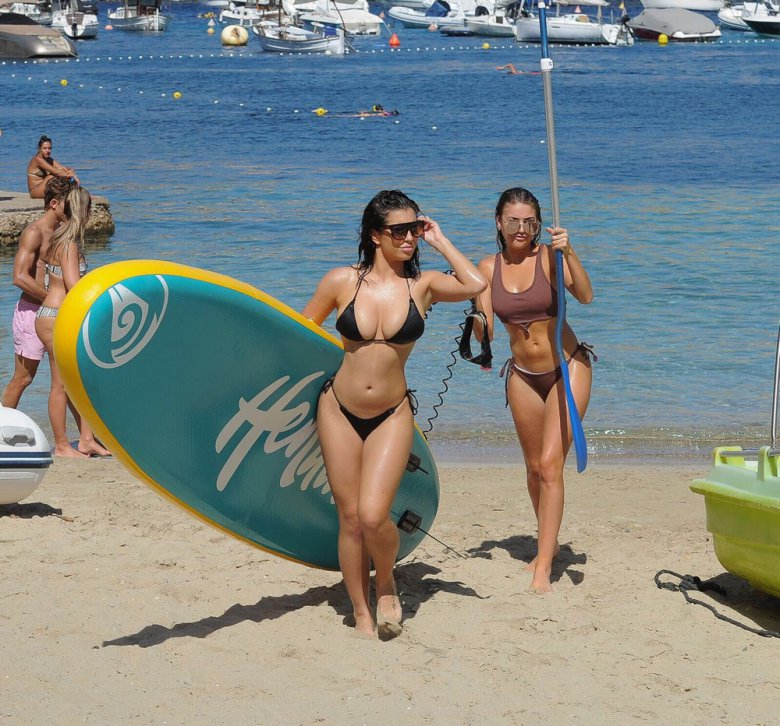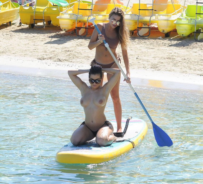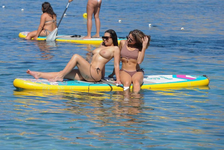 21-летняя британская модель и звезда реалити-шоу Кэти Сэлмон (Katie Salmon) катается на доске топлес с подругой во время отдыха на Ибице.