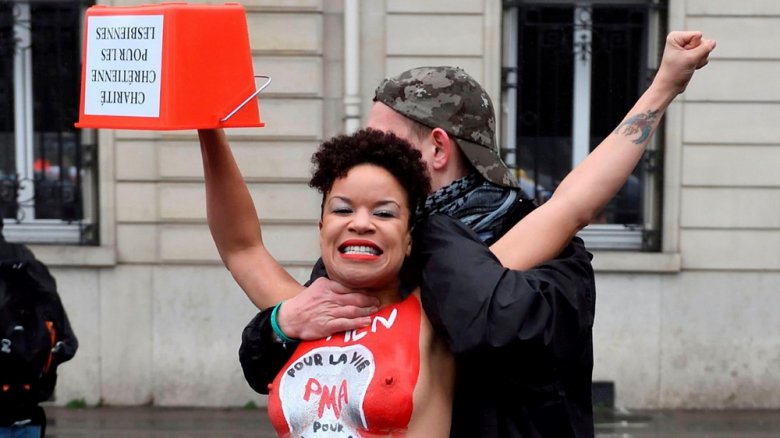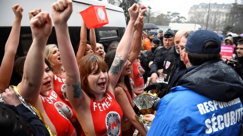 Полуголые феминистки вмешались в митинг против абортов в Париже