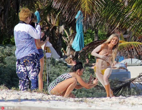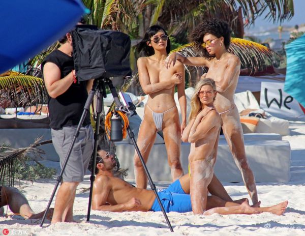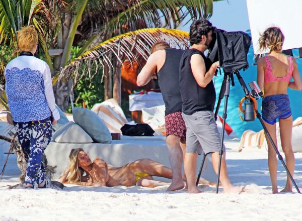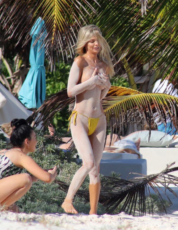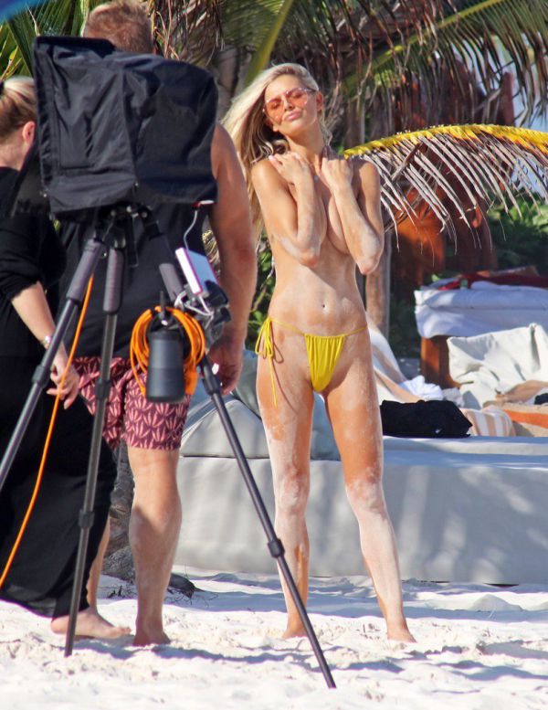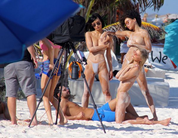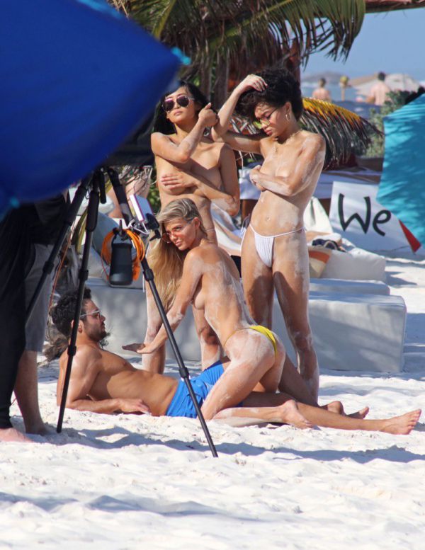 28-летняя канадская модель Даниэлль Кнудсон (Danielle Knudson) и другие модели позируют топлес на пляже в Тулуме, Мексика.