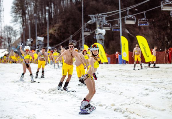 В мероприятии участвуют сотни сноубордистов и горнолыжников. Несмотря на холодную погоду, участники флешмоба спустились с горы в полуголом виде.