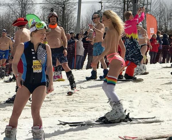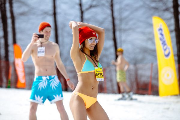 На сочинском курорте "Роза Хутор" состоялся бикини-спуск в рамках фестиваля Boogel Woogel. С горы одновременно съехали сотни полуголых мужчин и женщин.