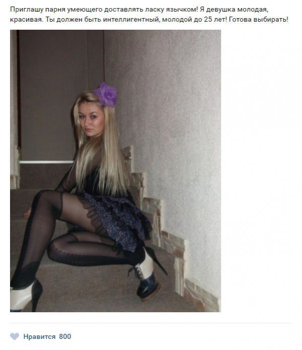 Сегодня мы приготовили для Вас сборник картинок под общим названием «Жещнины хотят секса» 20 (фото). Вы сможете увидеть сколько же различных дам страстно желают заняться сексом с молодыми парнями, о чем без особого стеснения или же неудобства пишут в социальных сетях.