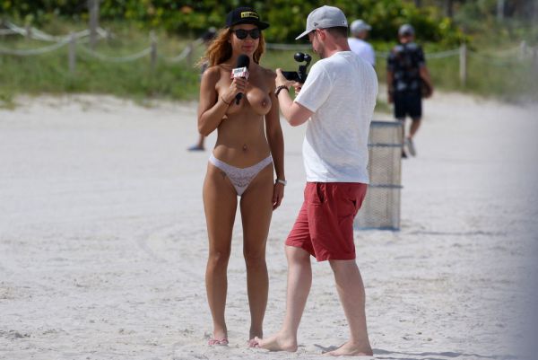 Канадская модель Марина Вальмонт (Marina Valmont) топлес на пляже во время съемок сюжета для программы "Naked News".