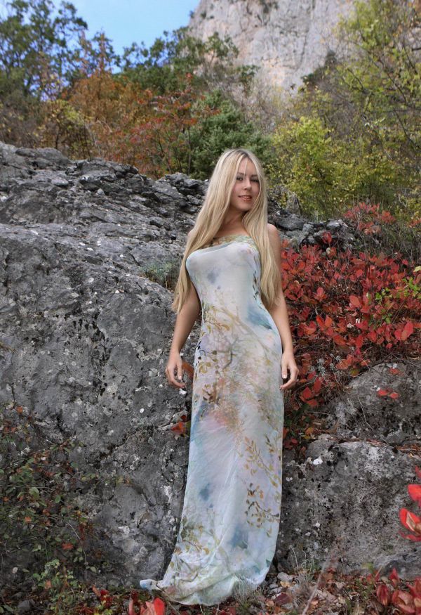Фотограф предложил симпатичной блондинке принять участие в откровенной фотосессии на природе. Наша героиня не смогла отказаться от заманчивого предложения и согласилась. Как только мужчина подобрал отличное место, девушка стала позировать перед объективом камеры. Сперва была в платье, а потом его сняла, чтоб показаться абсолютно голенькой…