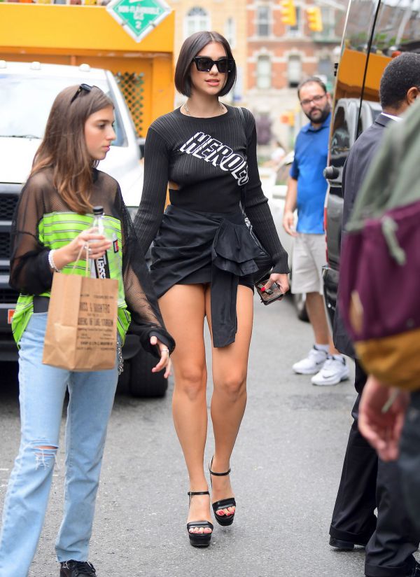 22-летняя британская певица и модель Дуа Липа (Dua Lipa) была замечена папарацци в коротенькой юбке и кофточке без бюстгальтера ранним утром на улице Нью-Йорка.
