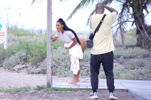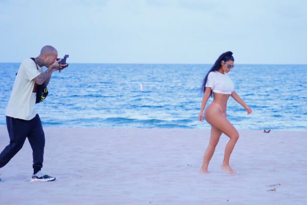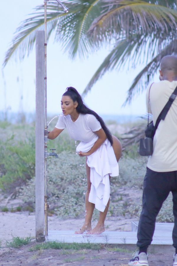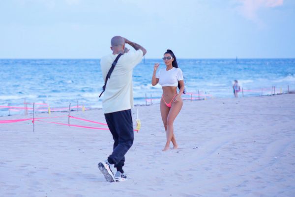 37-летняя американская звезда реалити-шоу, актриса и фотомодель Ким Кардашян (Kim Kardashian) в стрингах и белой маечке позирует на пляже в Майами.