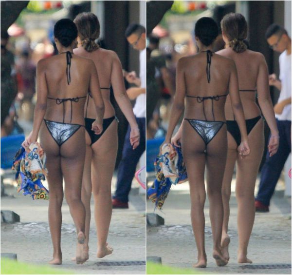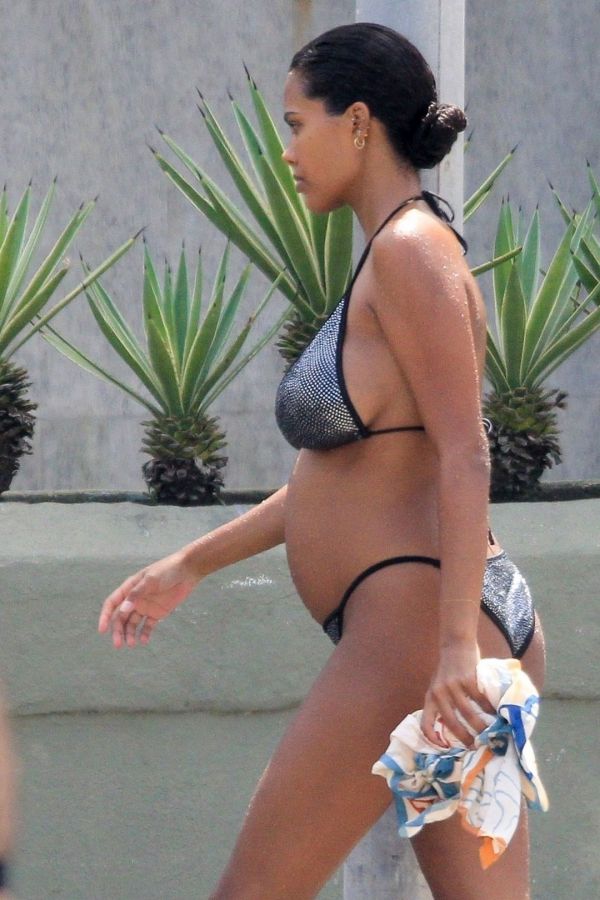 Беременная 21-летняя итальянская модель, актриса и жена французского актёра Венсана Касселя Тина Кунаки (Tina Kunakey) в бикини на пляже в Рио (январь 2019).