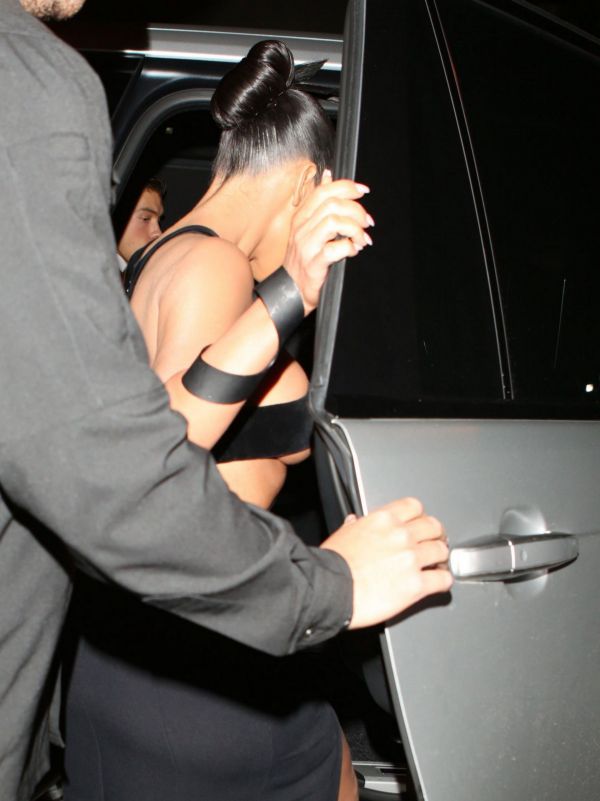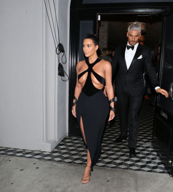 38-летняя американская звезда реалити-шоу, актриса и фотомодель Ким Кардашян (Kim Kardashian) в оригинальном платье покидает ресторан в Голливуде.