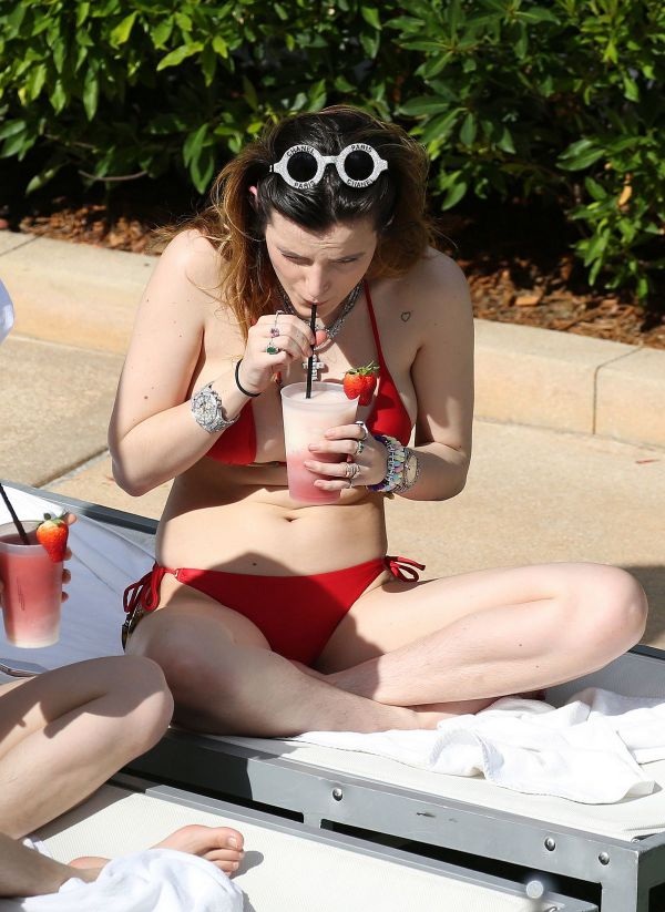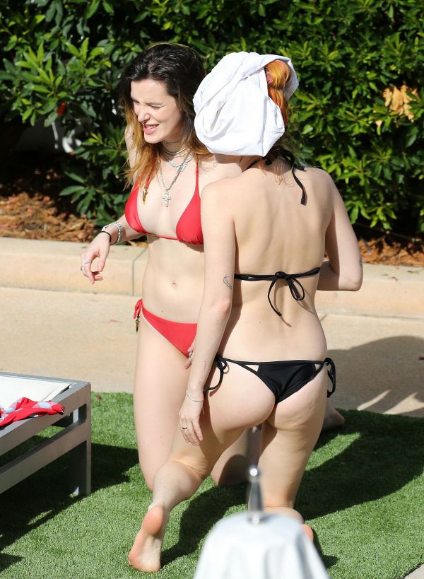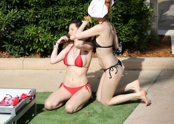 21-летняя американская актриса, певица и модель Белла Торн (Bella Thorne) продемонстрировала стройную фигуру в бикини и небритые подмышки во время отдыха с сестрой у бассейна в Майами.