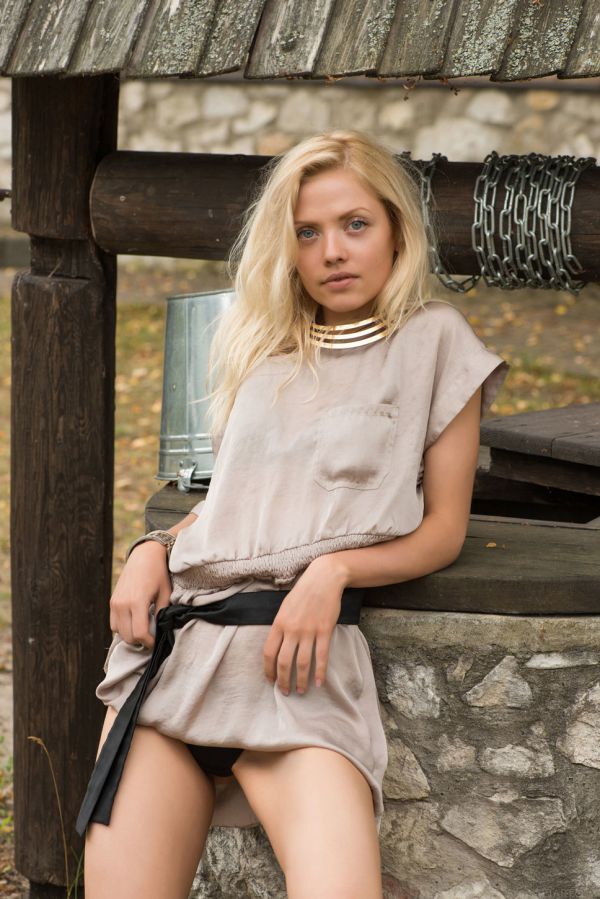 Подойдя к колодцу, деревенская красотка решила раздеться и попозировать голой. Сняв с себя платье и нижнее белье, блондинка начинает красоваться собой, хвастаясь упругой попкой...