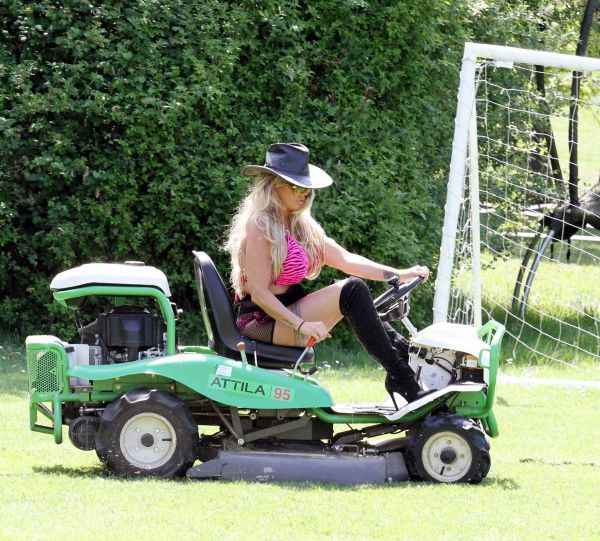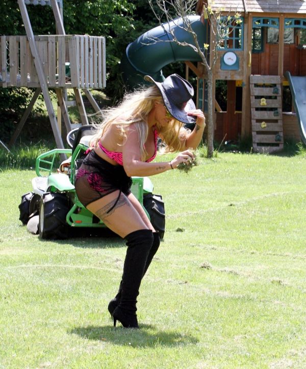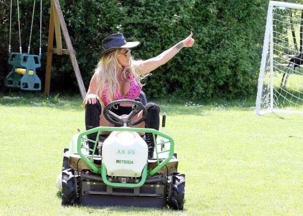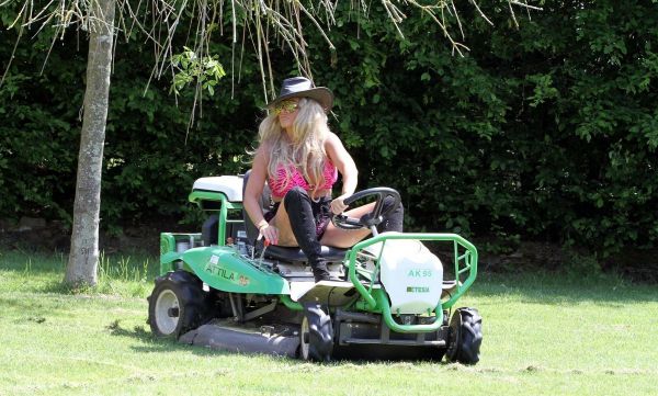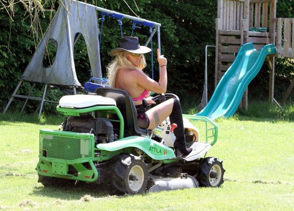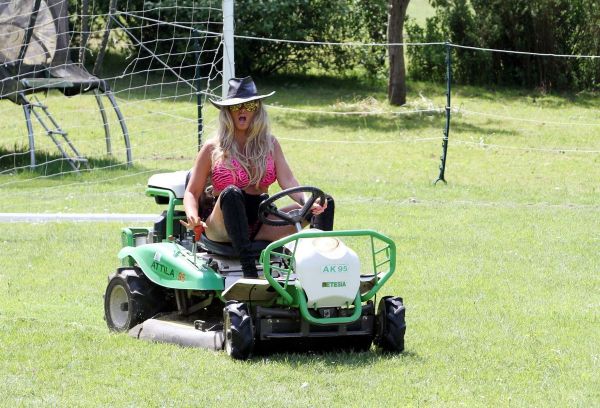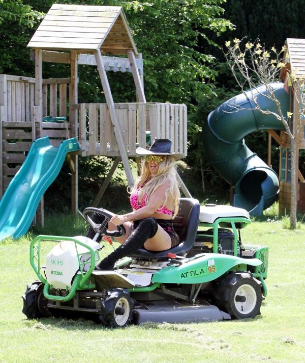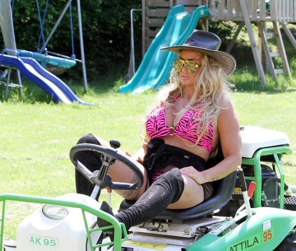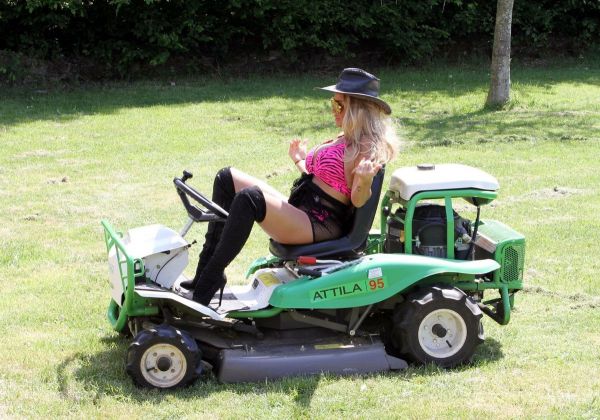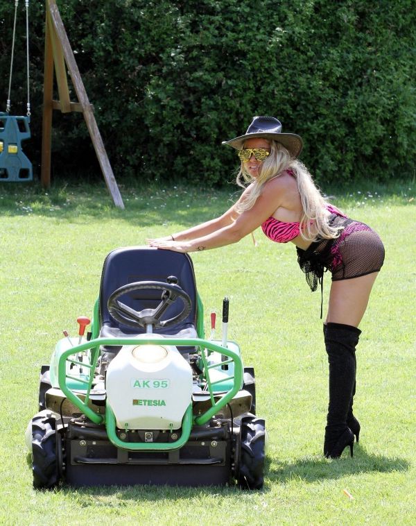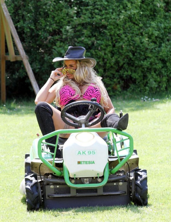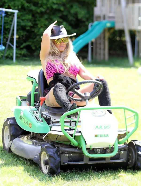 41-летняя британская певица, актриса, медийная личность и фотомодель Кэти Прайс (Katie Price) на газонокосилке