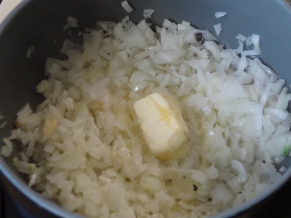 Как только лук слегка размякнет кидаем кусочек сливочного масла.